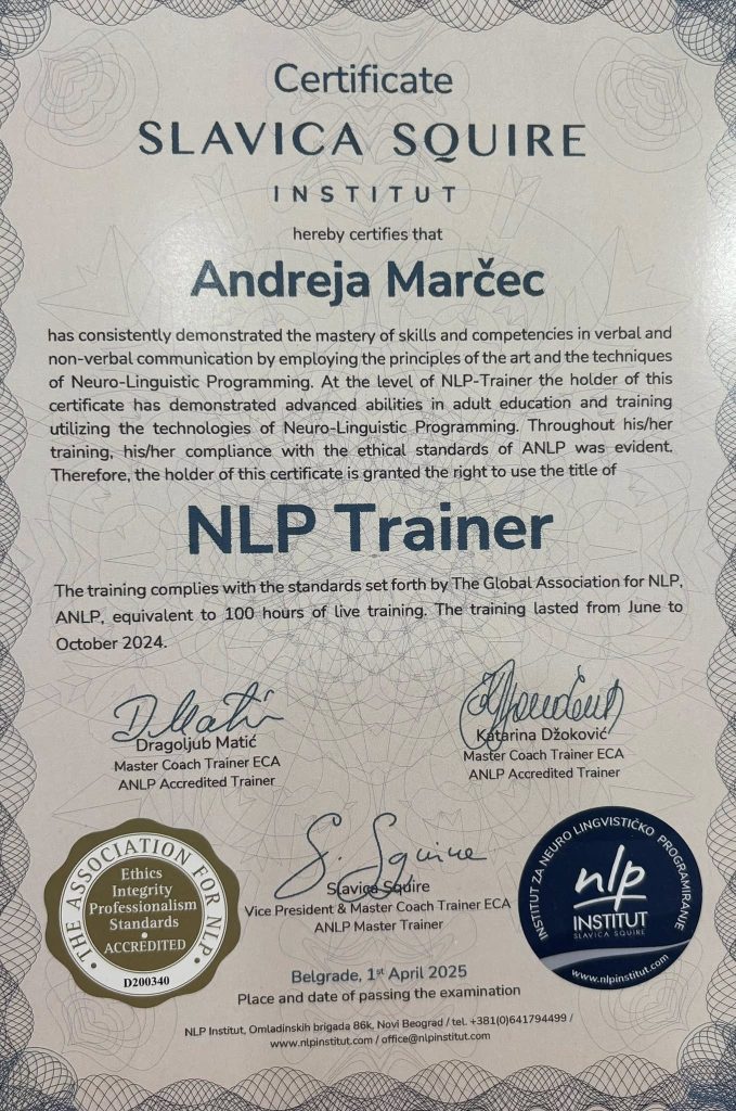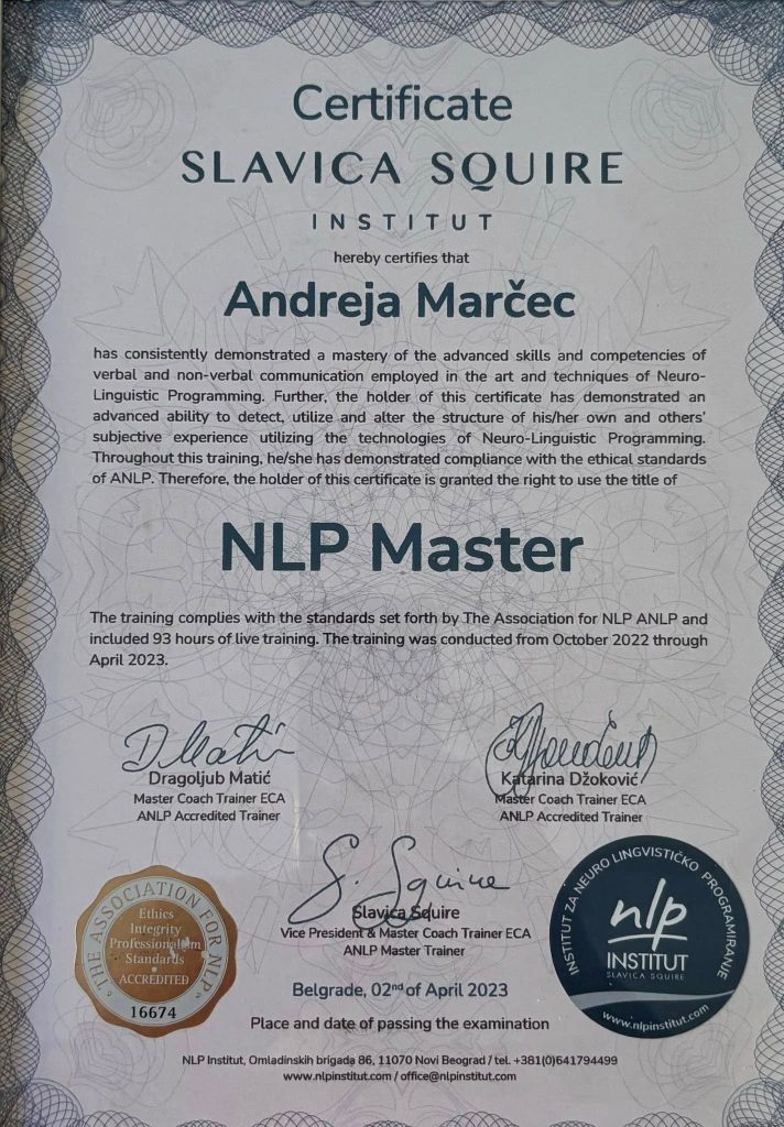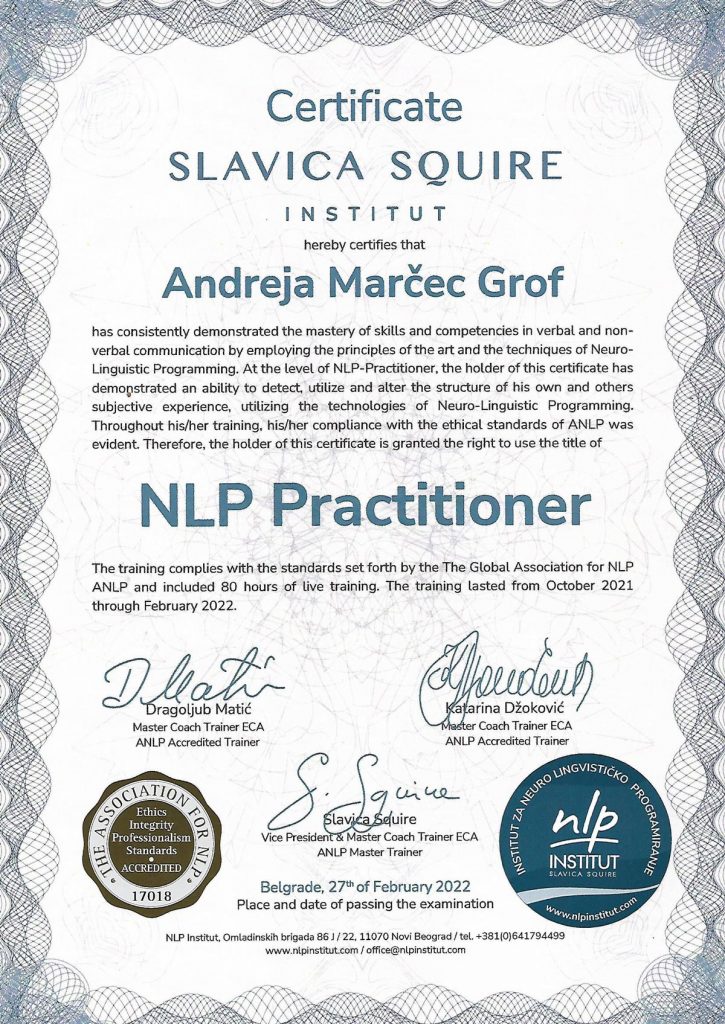 Studirajući NLP i učeći alate, kako bih što kvalitetnije i lakše pomogla svojim klijentima i svojim dragim ljudima, prvo sam i sama prošla ulogu klijenta.